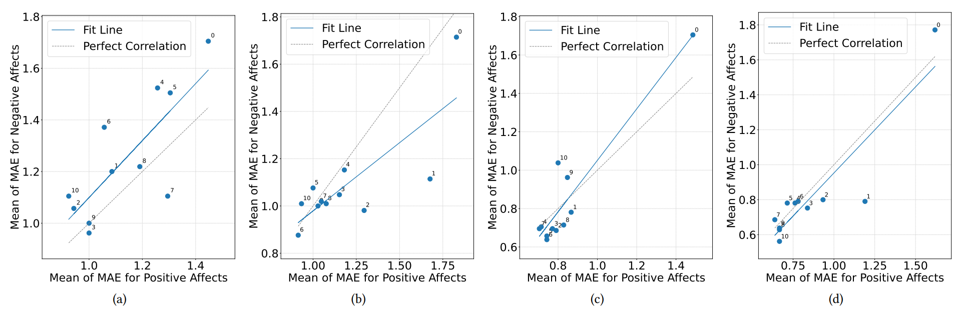 Figure 4: 네 명의 참가자에 대한 긍정 감정과 부정 감정 예측 간의 MAE가 선형적으로 비슷한 속도로 줄어들어, 두 감정 예측 간의 성능 향상이 일관된 관계를 나타냄
