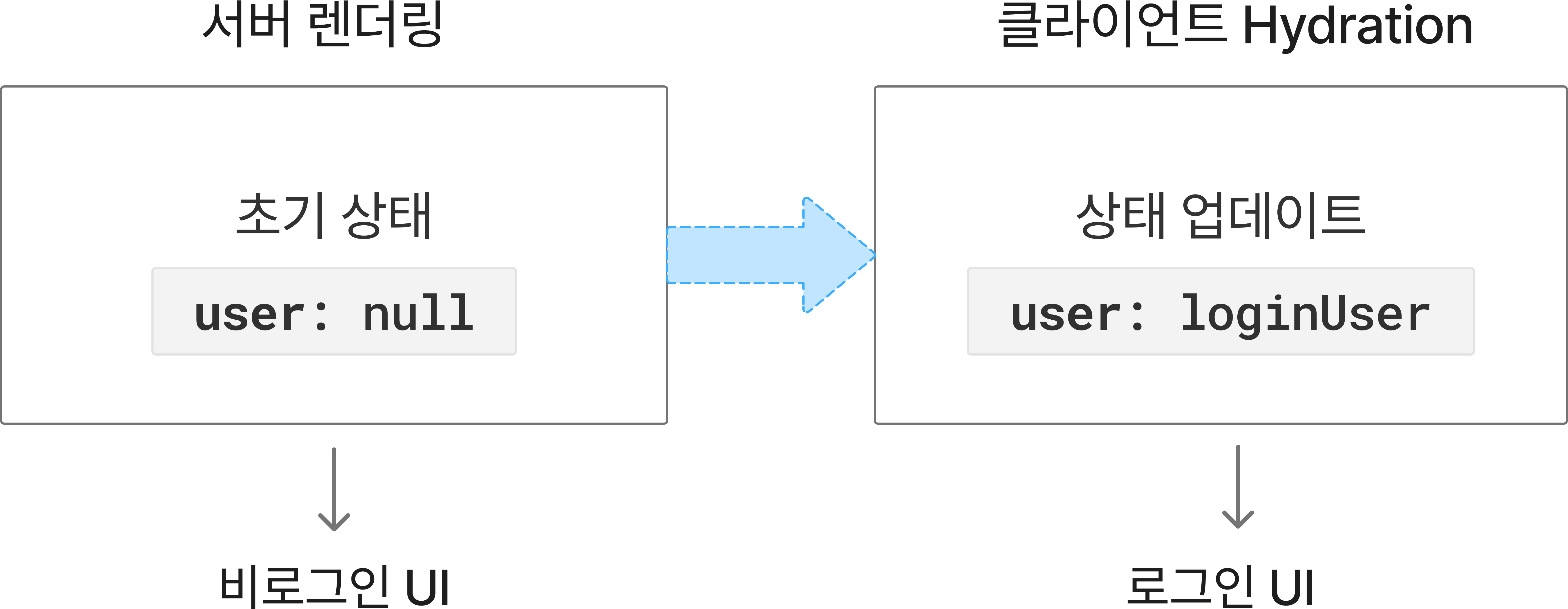 이런 구조로 인해 서버와 클라이언트에서의 상태가 일치하지 않으면 Hydration시 깜빡임 또는 UI 불일치가 발생할 수 있습니다.
