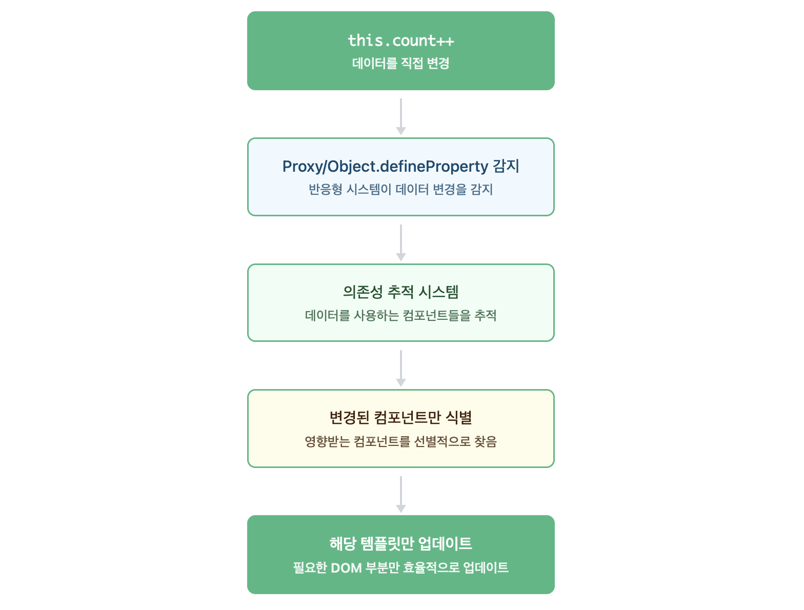 Vue는 세밀한 반응형 추적을 통해 변경된 부분만 자동으로 업데이트합니다.