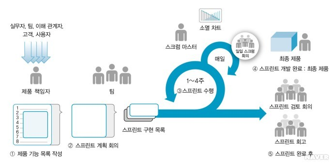 회의를 통해 스프린트 개발 주기를 정한 뒤, 이 주기마다 회의 때 정했던 계획들을 구현해나감