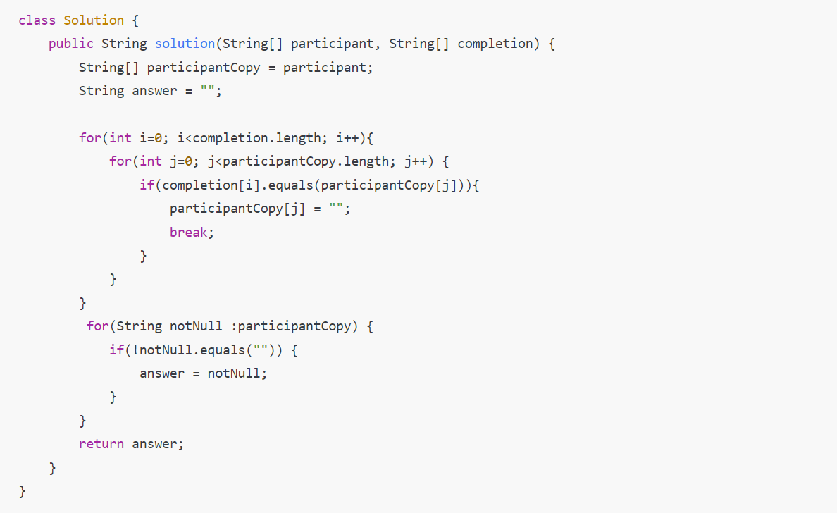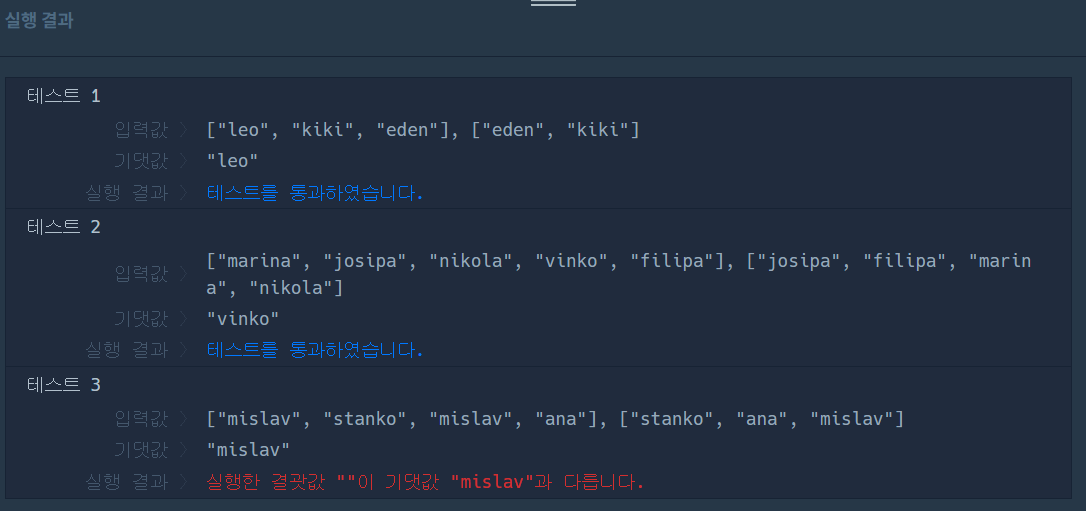 ๋จ, ๋ถ์ผ์น ๊ฐ์ด ๊ฐ์ฅ ๋ง์ง๋ง ์ธ๋ฑ์ค๋ผ๋ฉด ์ฒ์ ์ค์ ํ ""์ผ๋ก ๋์ค๊ธฐ ๋๋ฌธ์ if์กฐ๊ฑด์ ์๋ ๋ฐฐ์ด์ธ participant []์ ๋ง์ง๋ง ์ธ๋ฑ์ค๋ฅผ ๋ฐํํ๋ค.