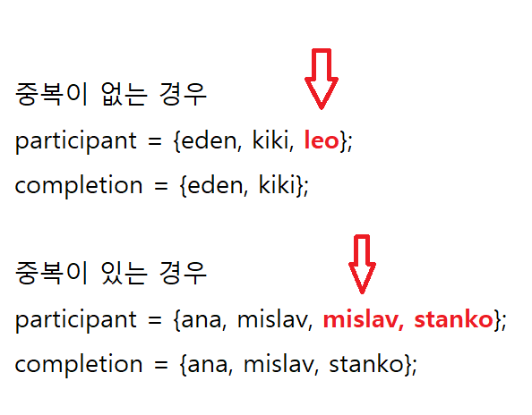 * completion์ ๊ธธ์ด๋ participant์ ๊ธธ์ด๋ณด๋ค 1 ์๋ค.