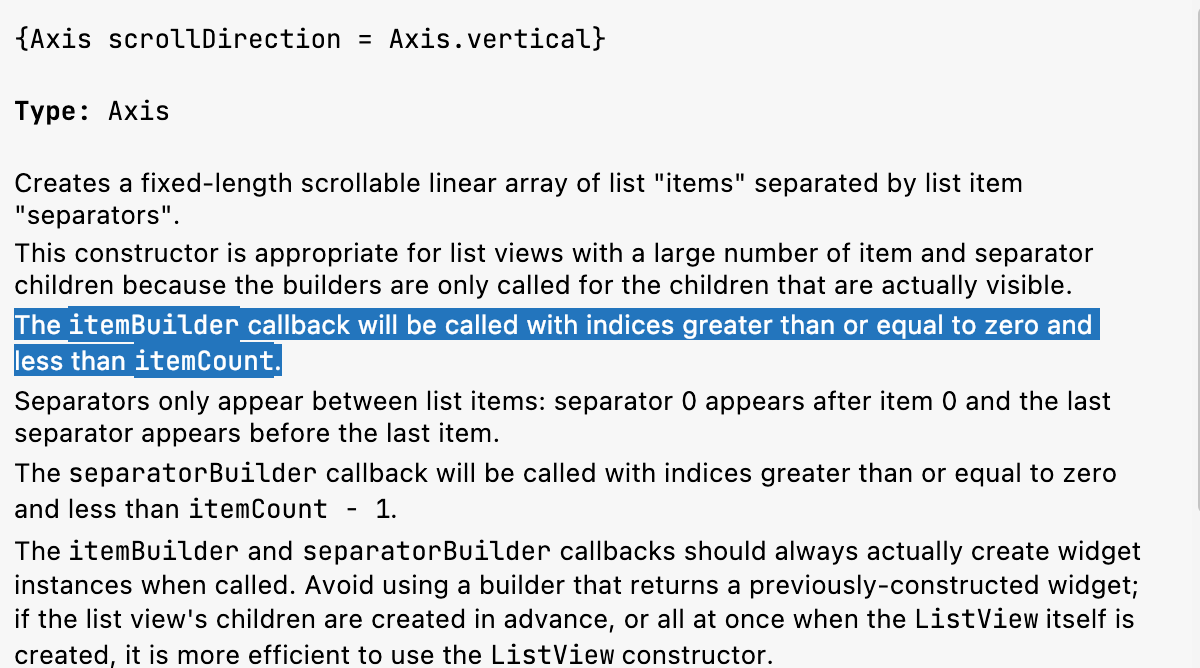 itembuilder callback은 0~아이템 개수까지 호출된다는 말 같다. 그래서 itemCount가 required인듯하다.