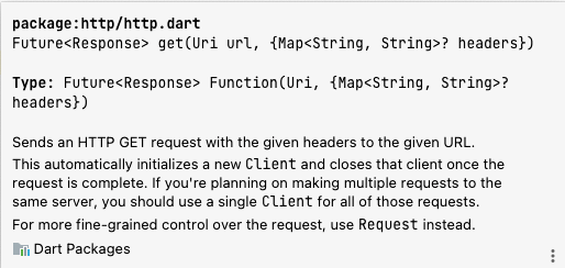 get 함수 위에 마우스를 올려보면 다음과 같은 사진이 나온다. 자세히 보면 반환형이 Future< Response >임을 알 수 있다.