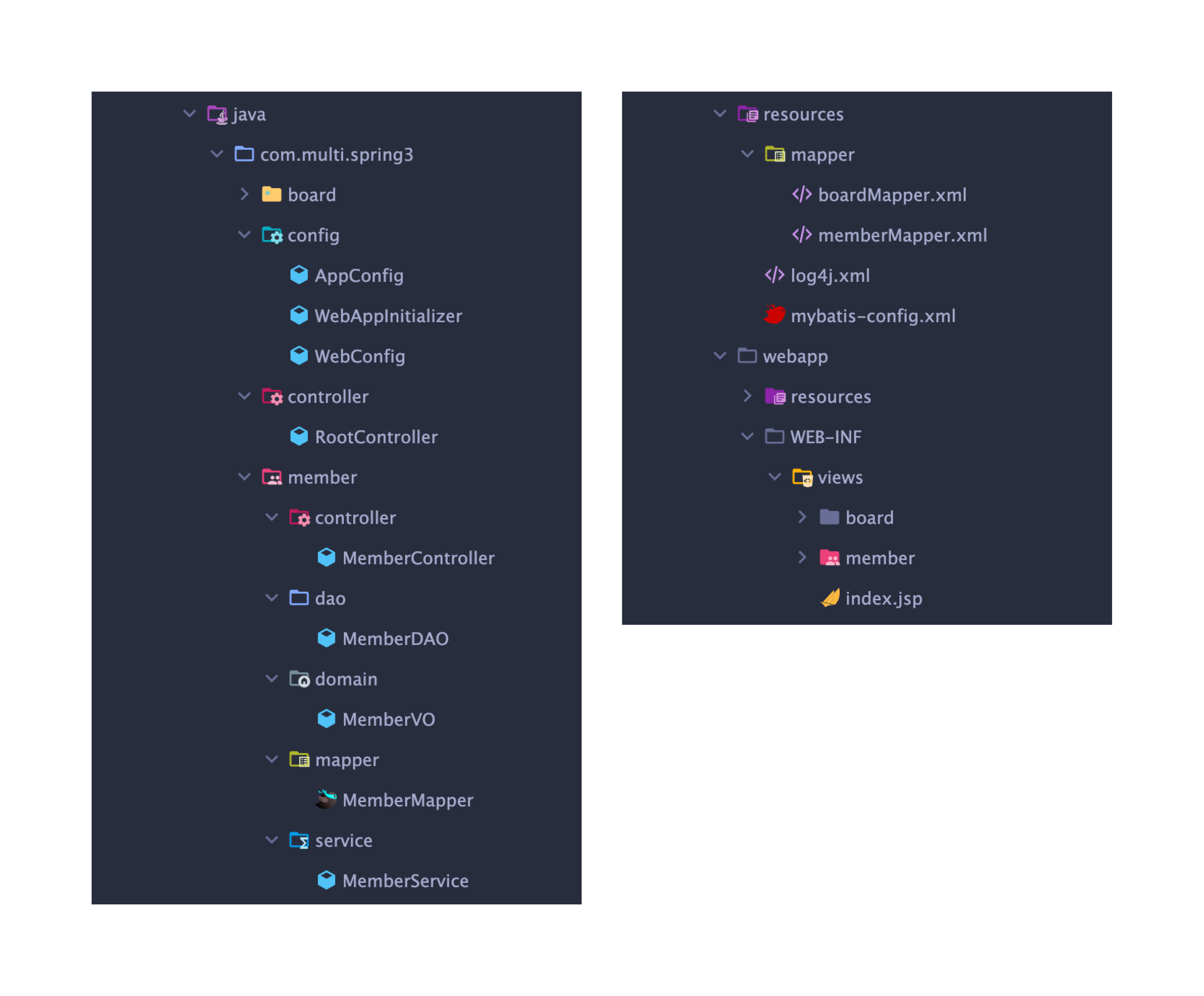 DAO, Mapper.java(인터페이스), Mapper.xml → 테이블 당 하나씩 생성