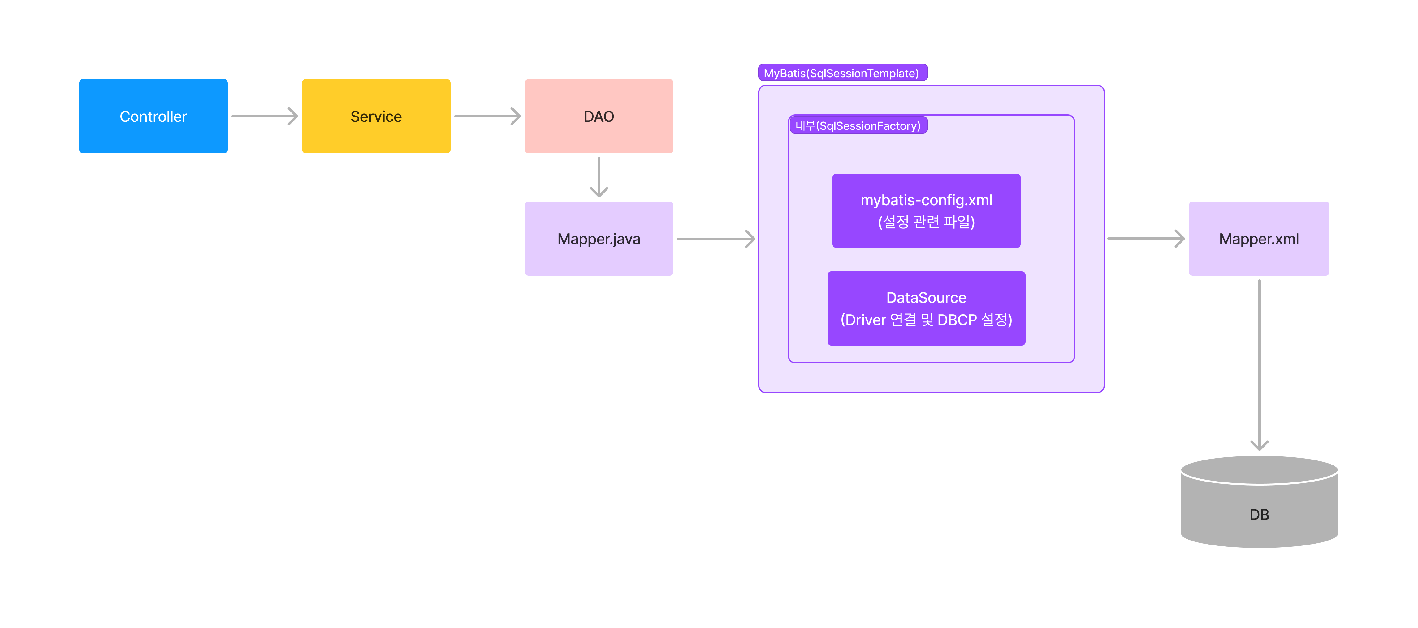 xml 설정 & DBCP 작업한 걸 config에 주입 → config를 mybatis(SqlSessionTemplate)에 적용 → mybatis가 DAO에 전달하는 흐름