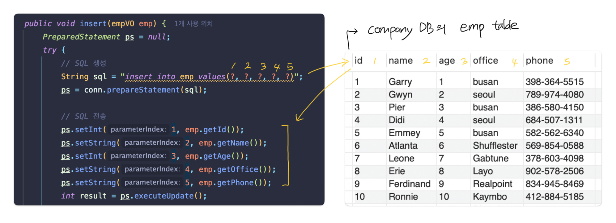 클라이언트가 보낸 데이터 받아서 JDBC API(자바 프로그램)가 아래와 같은 작업 처리하여 DB서버로 전달