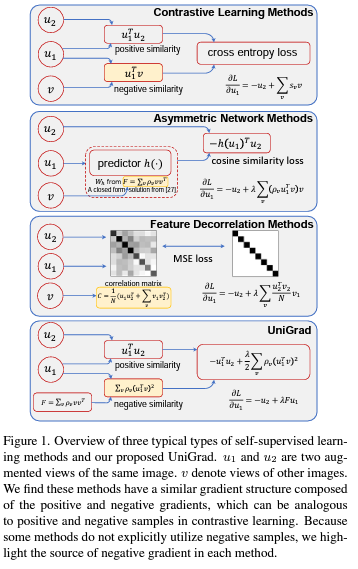 자기 지도 학습은 인간 주석 없이 강력한 시각적 표현을 추출할 수 있는 큰 잠재력을 보여주었다.다양한 관점에서 자체 지도 학습을 다루기 위해 다양한 작업이 제안된다. (1) 대조 학습 방법(예: MoCo, SimCLR)은 양성 및 음성 샘플을 모두 활용하여 훈련 방향을 안내한다. (2) 비대칭 네트워크 방법(예:BYOL, SimSiam)은 예측자 네트워크의 도입과 정지 그레이디언트 연산을 통해 음성 샘플을 제거한다. (3) 대신 특징 차원 간의 중복을 줄이는 것을 목표로 하는 상관 관계 방법(예: Barlow Twins, VICReg)을 특징으로 한다.이러한 방법은 설계된 손실 함수에서 다양한 동기와 상당히 다른 것으로 보인다.최종 정확도 수치는 또한 다양하며, 여기서 다른 네트워크와 트릭은 다른 네트워크에서 사용된다.본 연구에서는 이러한 방법이 동일한 형태로 통일될 수 있음을 보여준다.손실 함수를 비교하는 대신 기울기 분석을 통해 통합 공식을 도출한다.또한 공정하고 상세한 실험을 수행하여 성능을 비교한다.이 방법들 사이에는 차이가 거의 없는 것으로 드러났으며, 모멘트 맨코더의 사용이 성능을 향상시키는 핵심 요소이다. 이 통합 프레임워크에서, 우리는 자체 지도 학습을 위한 간단하지만 효과적인 그레이디언트 형태인 UniGrad를 제안한다.메모리 뱅크나 예측자 네트워크가 필요하지 않지만 여전히 최첨단 성능을 달성하고 다른 훈련 전략을 쉽게 채택할 수 있다.온라인에서의 광범위한 실험은 평가이며 많은 다운스트림 작업도 효과를 보여준다.코드가 해제되어야 한다.