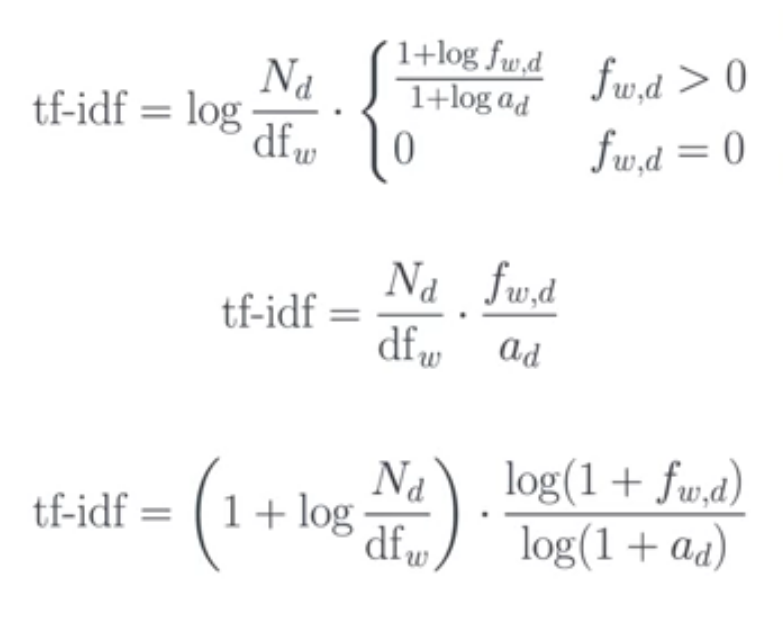 비교로 텍스트의 긍정적/부정적 감정 파악 TF-IDF는 휴리스틱이므로, 다양한 형태로 정의할 수 있다.
