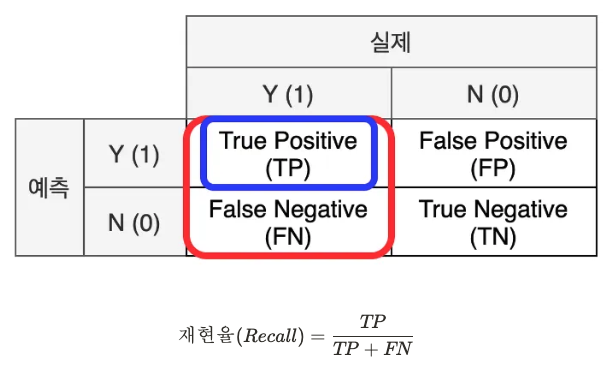 -재현율(Recall) : 실제 값이 양성인 데이터 중 모델이 양성으로 예측한 비율, 데이터 관점