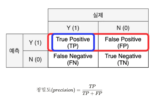 -정밀도(Precision) : 모델이 양성(1)로 예측한 결과 중 실제 양성의 비율, 모델 관점