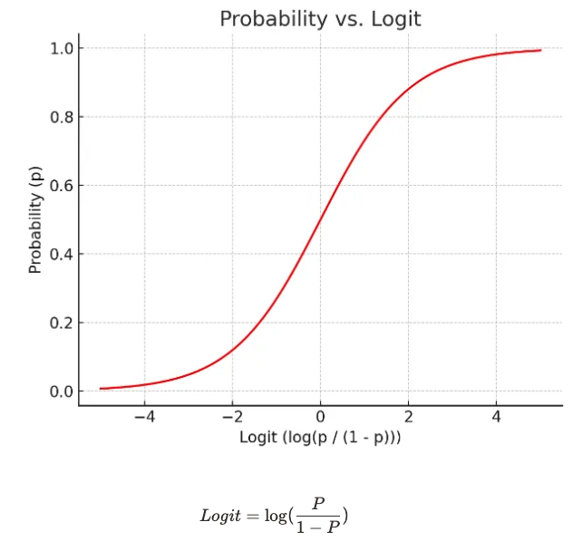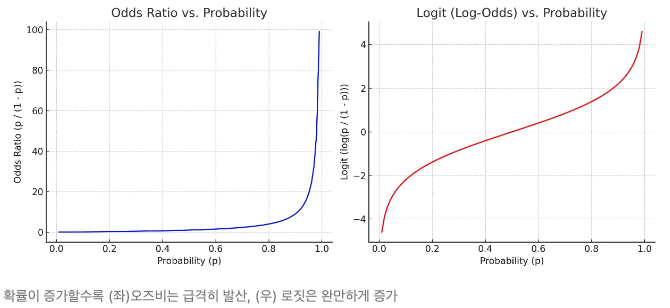 - 로짓(logit) : 확률은 0과 1 사이인데, 확률이 증가할수록 오즈비가 급증해 선형성을 따르지 않기 때문에 로그를 씌워 보정한 것