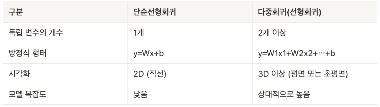 - 다중 선형 회귀 : 독립변수(X)가 여러개 일 때 사용