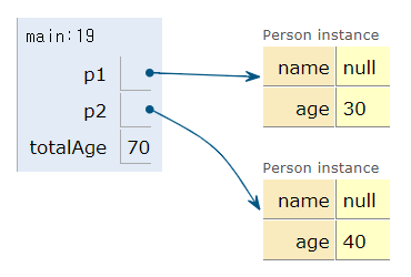 int totalAge = p1.age + p2.age; // 연산 가능, age는 기본형
