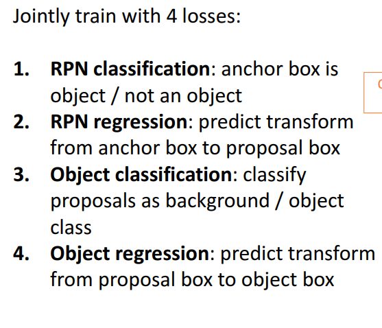 - RPN regression loss: Anchor Box → Proposal Box로 변환하는 변형(Transformation) 예측, bounding box를 조정하는 regression 진행