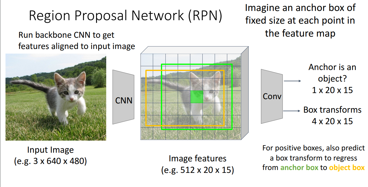- 이를 위해 Region Proposal Network(RPN)을 삽입하는 것으로 영역 제안을 예측하는 역할을 함