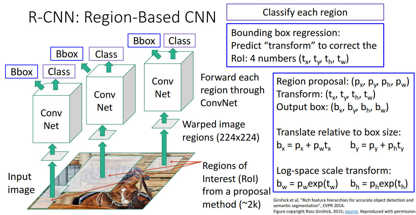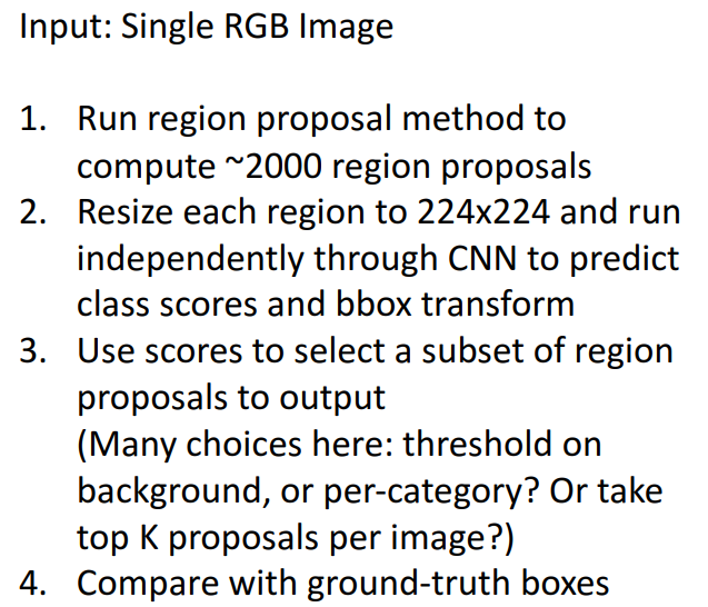 - 각 Region Proposal을 224×224 크기로 변환하고, 변환된 Region을 CNN에 개별적으로 입력하여 클래스 점수 및 바운딩 박스 변환(Regression) 수행