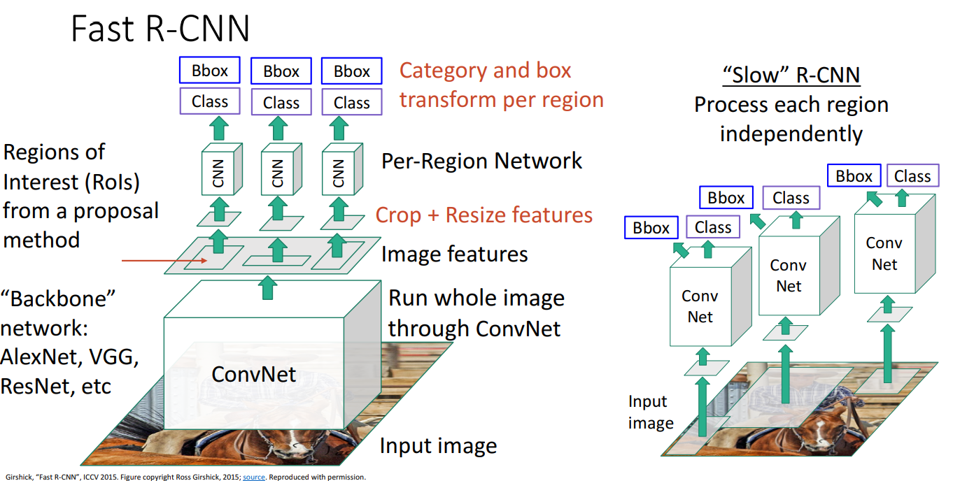 - Slow R-CNN의 문제점: 각 Region Proposal된 image에 대해 forward pass가 진행되어야 하므로 매우 느리다는 단점