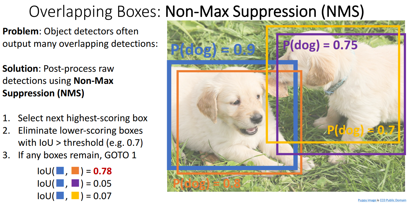 - 가장 분류 점수가 높은 box를 선택하고, 그 다음 확률이 높은 box와 비교했을 떄 IoU가 threshold(ex) 0.7)보다 크면 같은 객체에 대한 중복 box라고 판단하여 box 제거 (아 작업 반복)