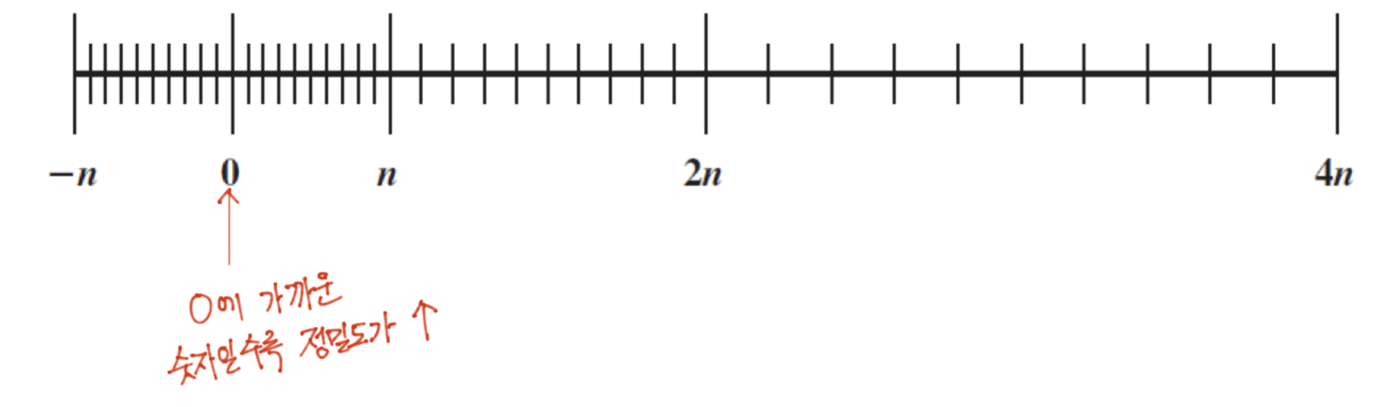 그렇기 때문에 정수는 균일한 간격, 같은 정밀도로 수들을 표현하게 됩니다.