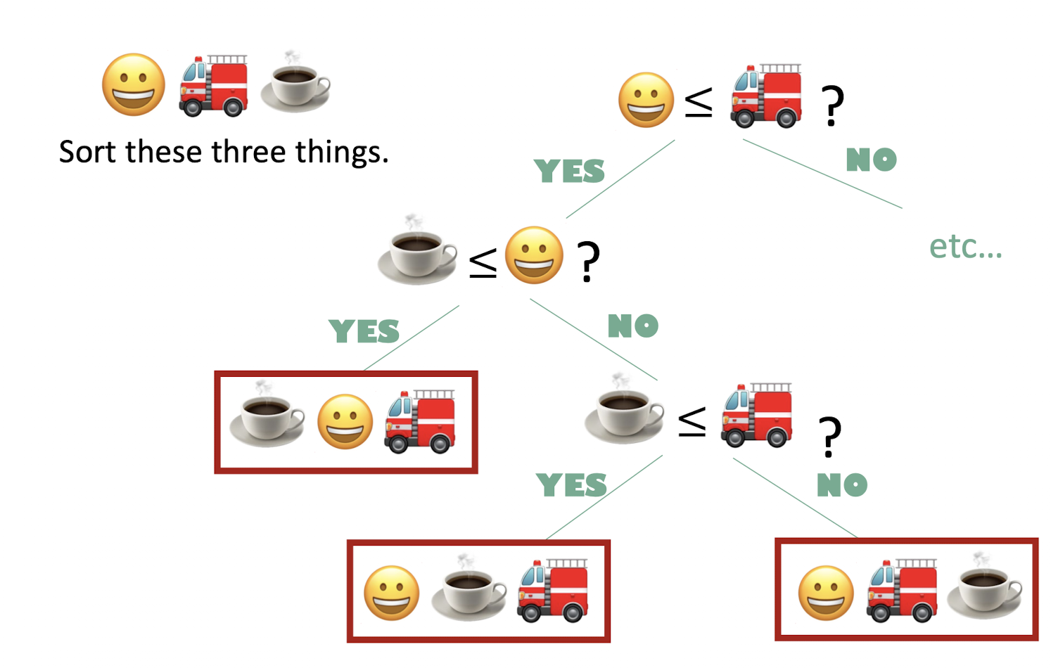 이렇게 3개를 정렬하는 경우 하나하나 비교하며 모든 경우의 수를 찾아본다고 했을 때, 이진트리가 만들어진다.