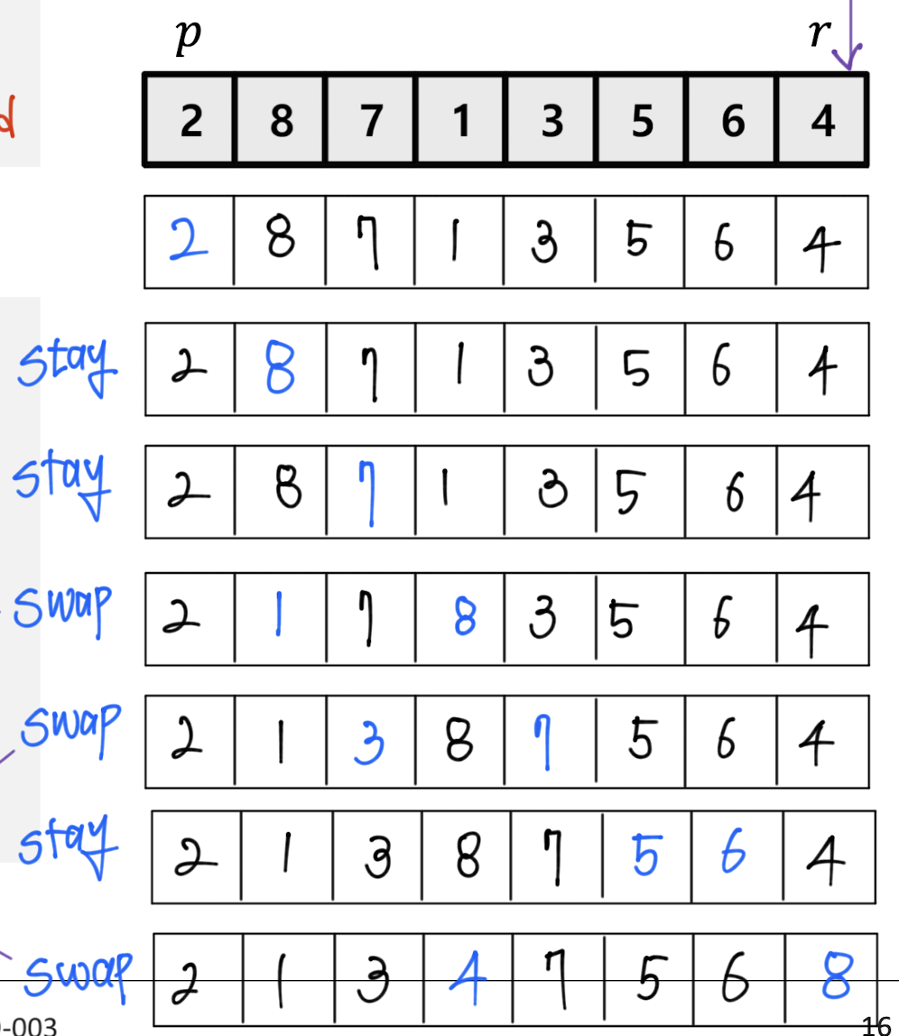 - A[p:i]≤pivot, A[i+1:r−1]>pitvot, A[r]=pivot