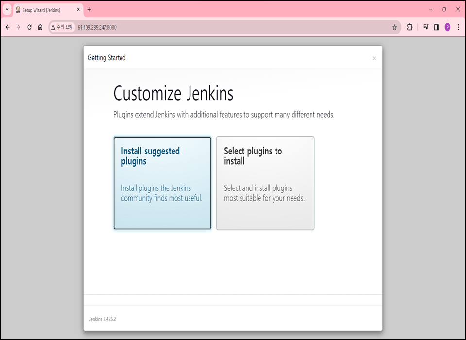 http://{host ip:8080에 매핑한 포트}/ 를 입력하여 Jenkins의 초기페이지에 진입하여,