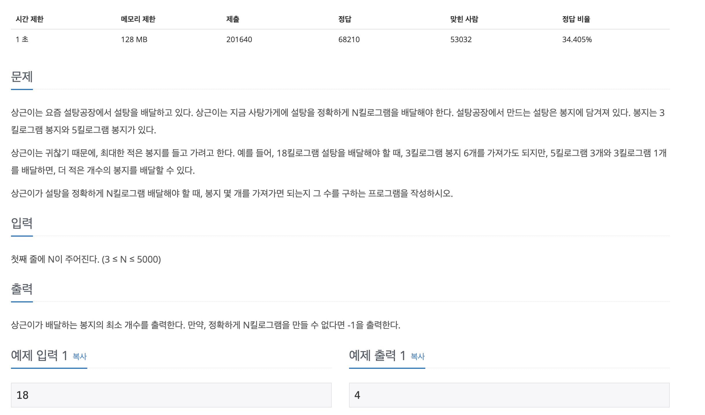 상근이가 설탕을 정확하게 N킬로그램 배달해야 할 때, 봉지 몇 개를 가져가면 되는지 그 수를 구하는 프로그램을 작성하시오.