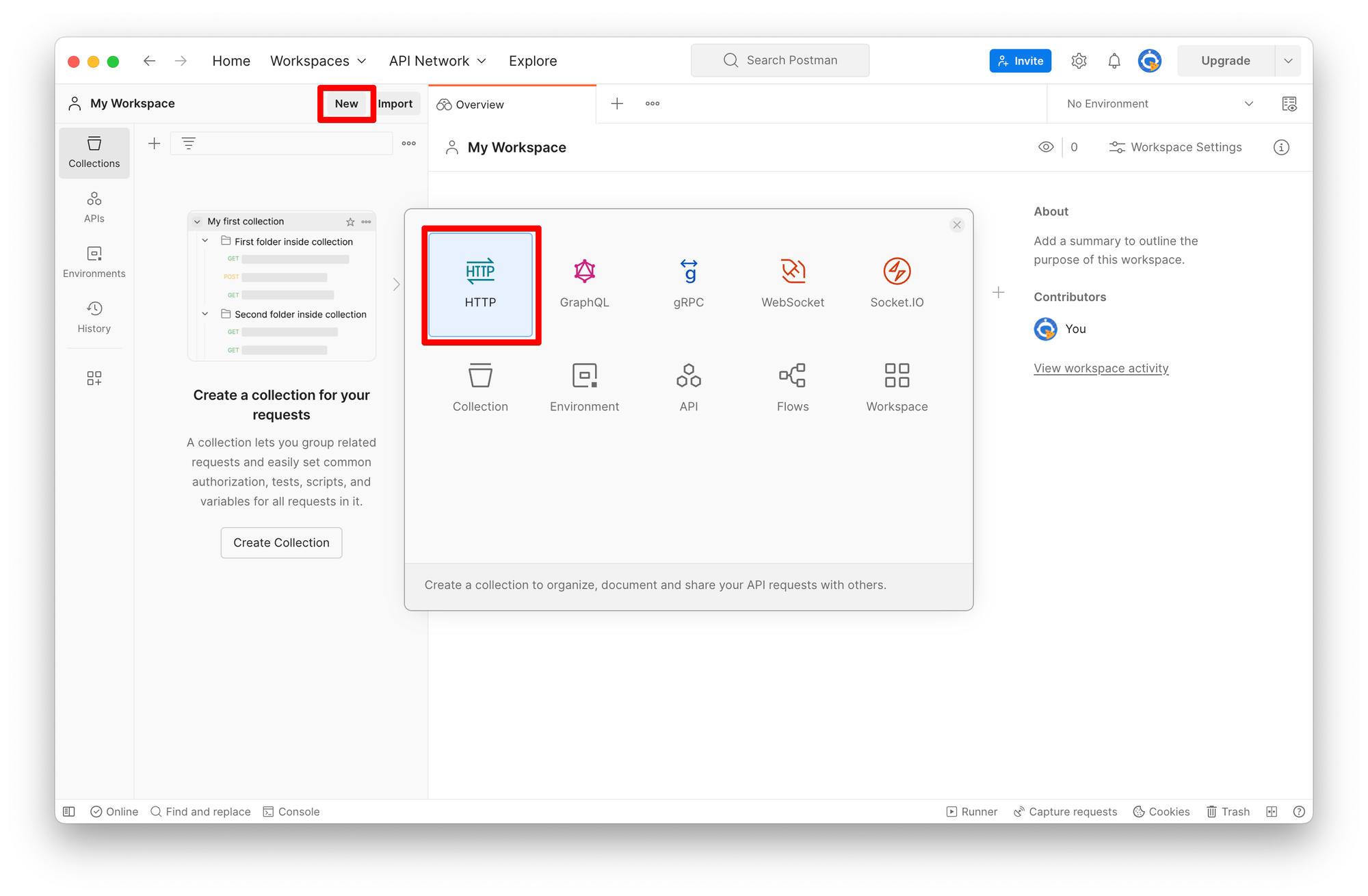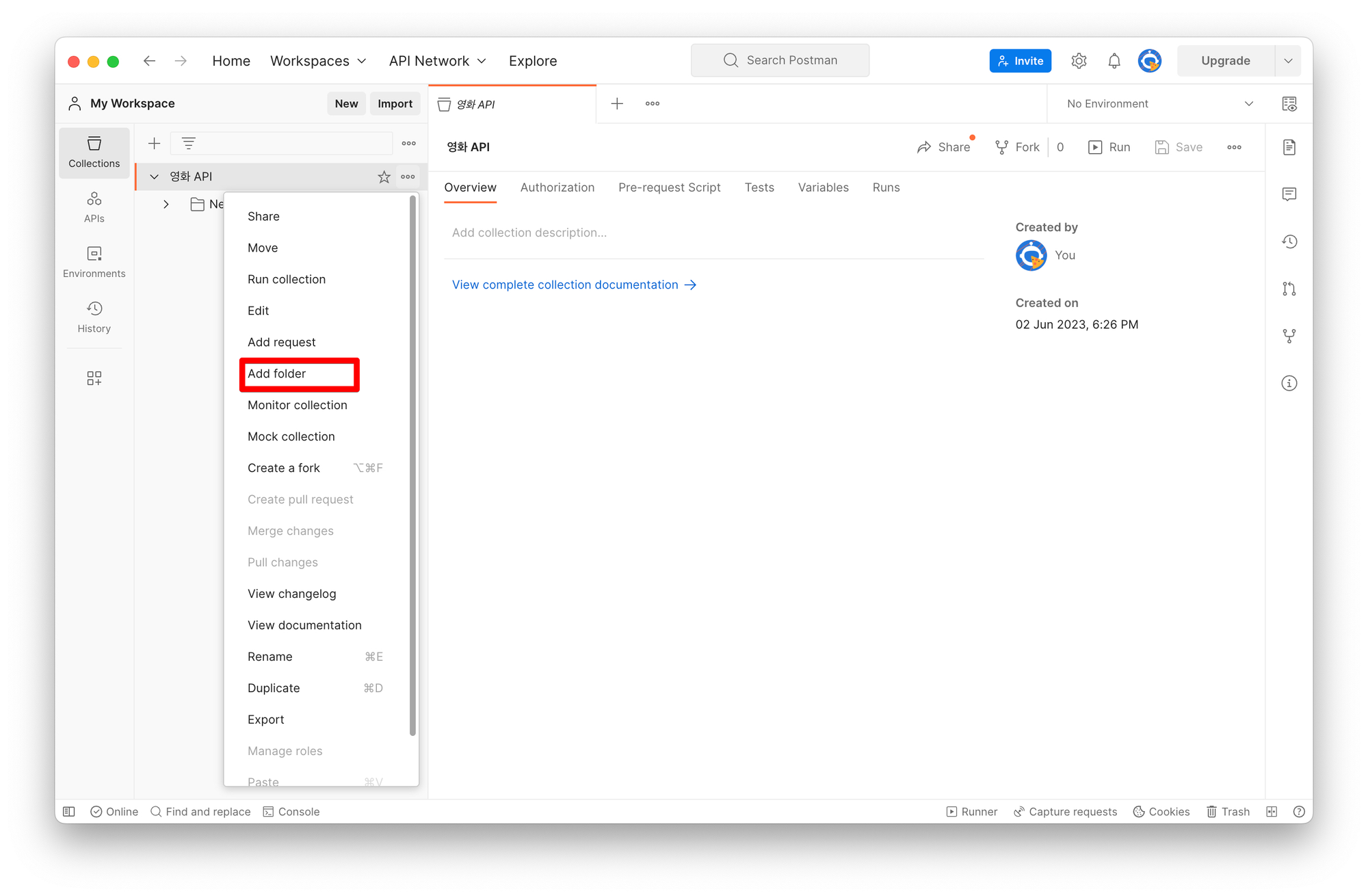 - 모든 HTTP 요청은 Collection에 포함되어 있다.