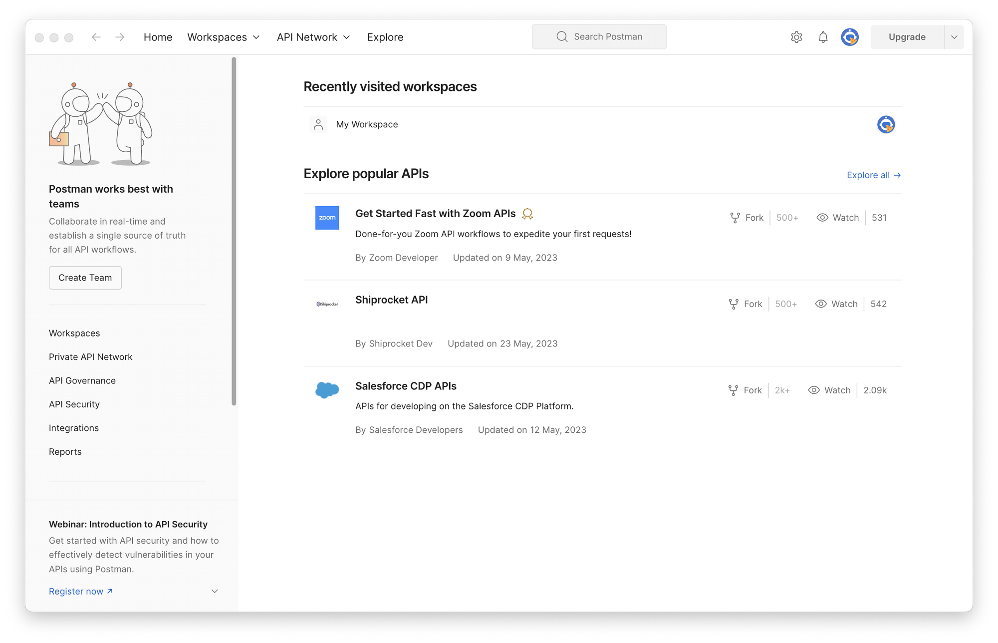 - Workspaces는 포스트맨의 모든 기능을 담고 있는 뷰