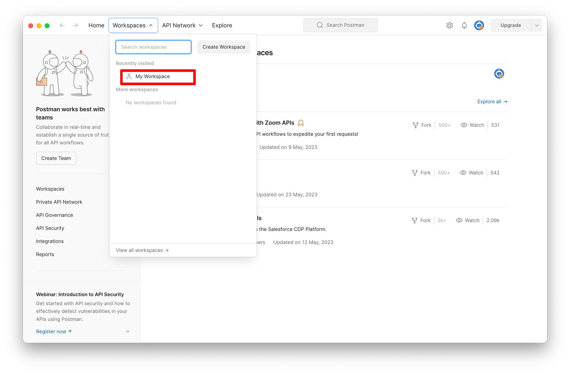 - Workspaces 생성 → 새로 워크스페이스를 생성하거나 기본적으로 만들어져있는 My Workspace에 진입한다.