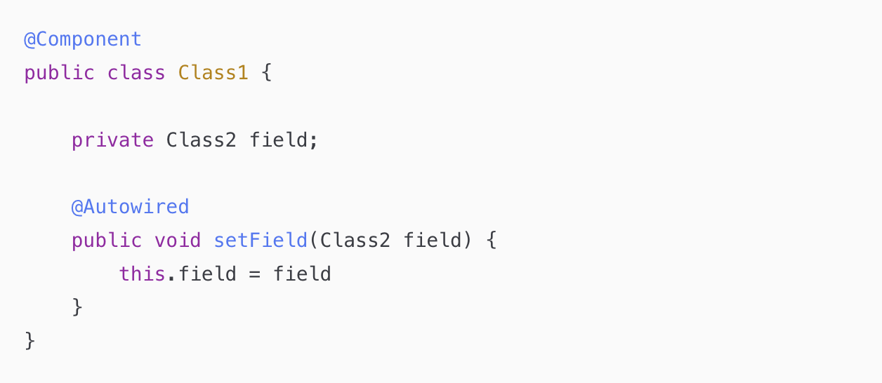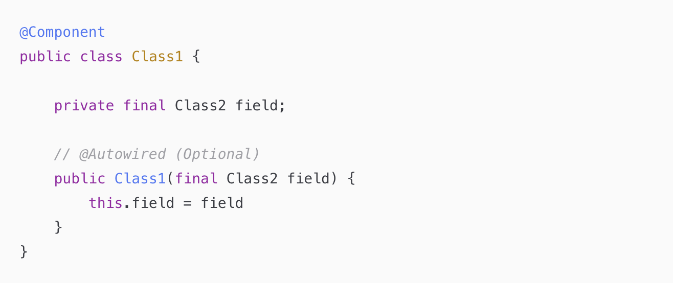 cf. 수정자 주입과 마찬가지로 필드가 final이 아니므로 변경될 여지가 있다. 메서드와 필드 주입 시의 메서드, 필드의 접근제어자는 private도 가능