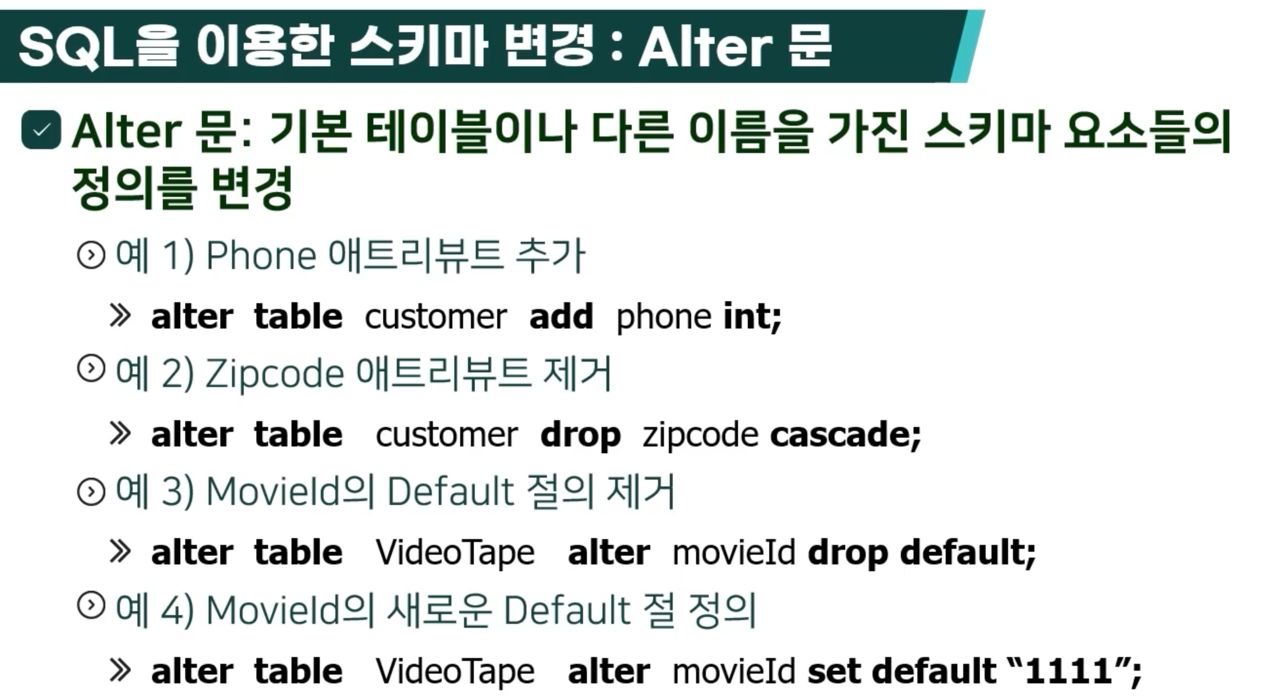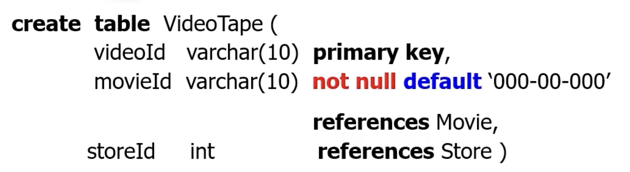 - Default <값> : 애트리뷰트에 명시적으로 값을 주지 않으면, 새로운 튜플을 사입할 때 이 애트리뷰트의 디폴트 값이 들어감