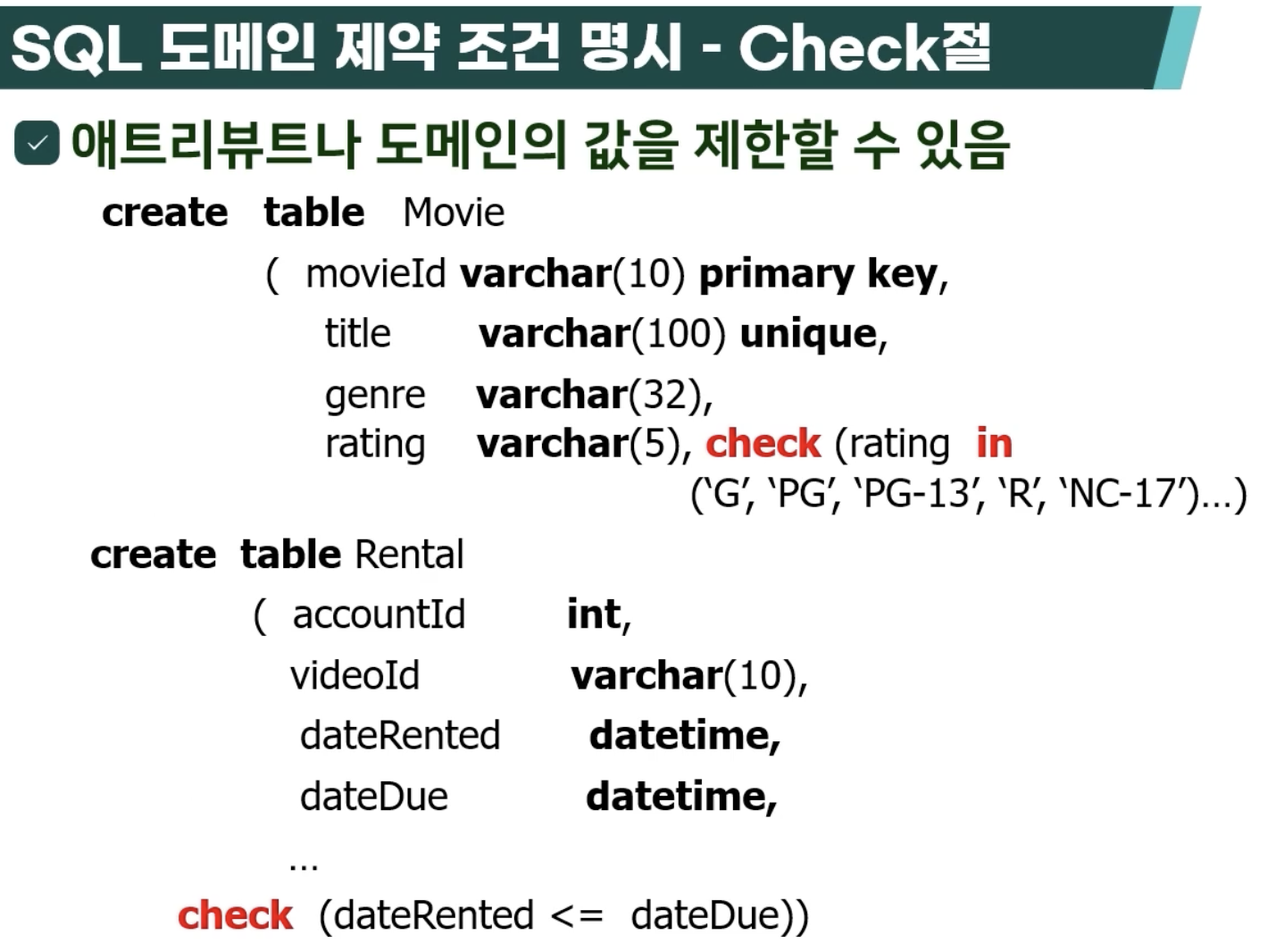 - rating은 공백 _ _ _ _ _ 부터 zzzzz까지 다 되는데(varchar(5)) 이때 check로 조건 → G, PG~NC~~만 나올 수 있음