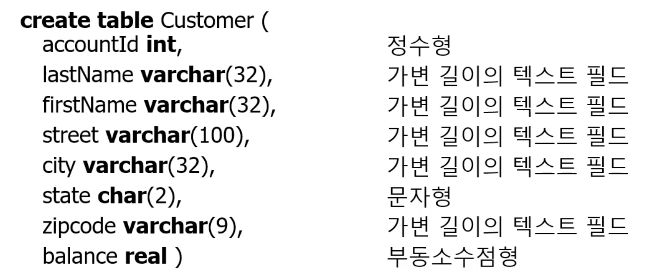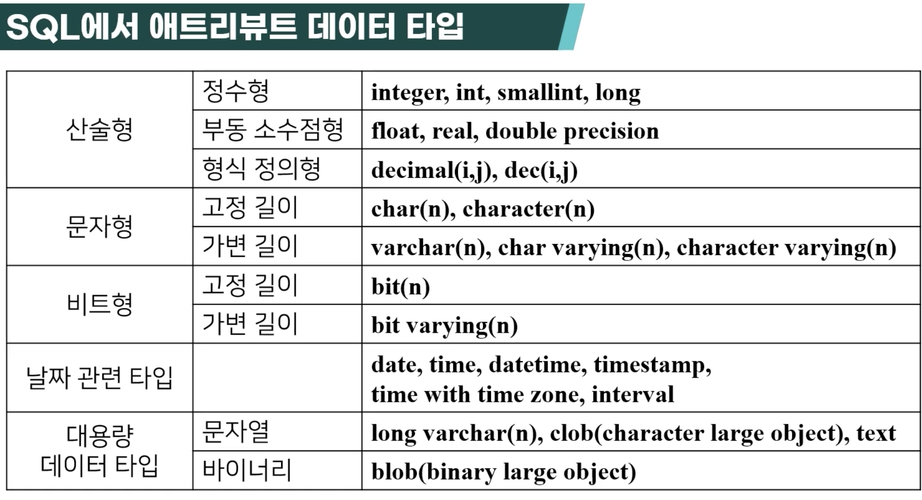 - 정수와 실수, 논리형 , 문자, 고정 길이 문자열, 가변 길이 문자열, 날짜 …