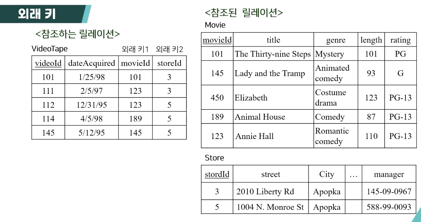 - 한 릴레이션에 있는 튜플이 다른 릴레이션에 있는 튜플을 참조하려면 반드시 참조되는 튜플이 그 릴레이션 내에 존재해야 함