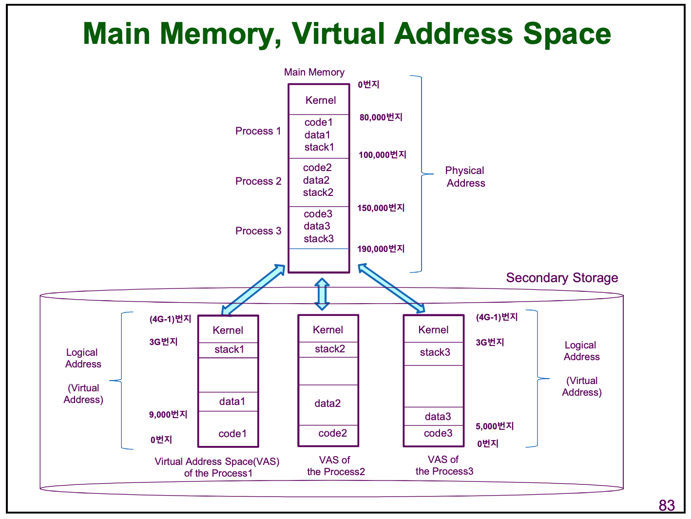 각 프로세스마다 보조기억장치내에 Virtual Address Space를 가짐