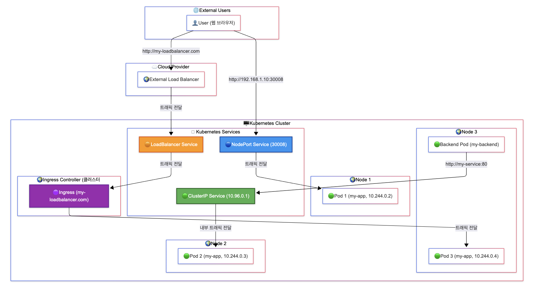 TargetPort: Pod 내부에서 애플리케이션이 실행되는 포트 (예: 80)Port: Service에서 사용할 포트 (80)NodePort: 노드에서 외부에 개방할 포트 (30008)✅ 예제 : 사용자는 http://<노드IP>:30008로 접근 가능