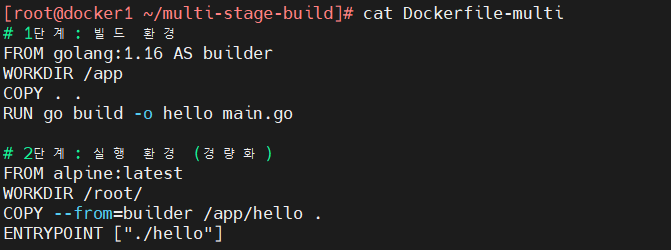 FROM golang:1.16 → 이 이미지는 Go 개발을 위한 빌드 도구(컴파일러, 패키지 관리자 등)가 포함된 무거운 환경.RUN go build -o hello main.go → 빌드가 완료된 이후에도 빌드 도구가 그대로 남아 있어 이미지가 커짐.이제 빌드 환경과 실행 환경을 분리하여 최적화한다.