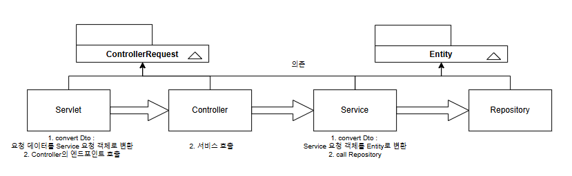 [Servlet] → [ControllerRequest] → [ServiceRequest] → [Service] → [Entity] → [Repository]
