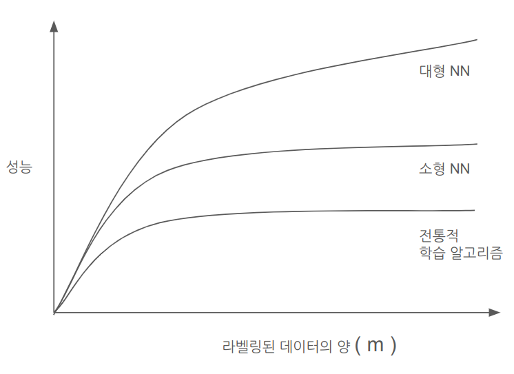 머신러닝의 구현 방법에 따라, 라벨링된 데이터의 양에 따른 성능이 다르다.