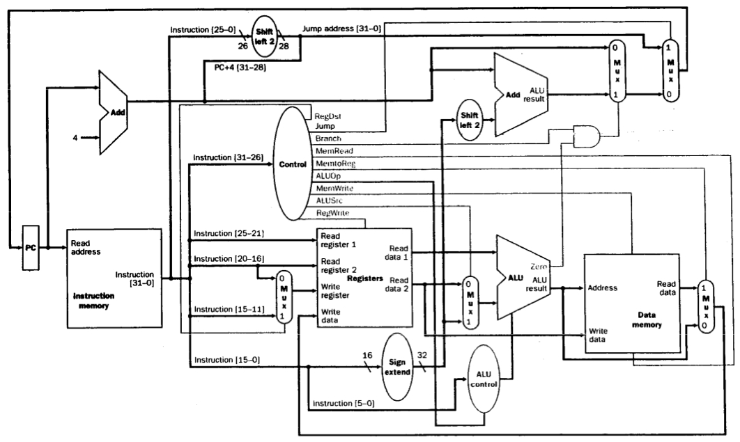- Datapath : 데이터와 주소를 처리하는 CPU내 요소 (레지스터, ALU, mux, 메모리 등)