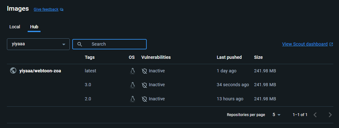 ex ) [ docker Id ] / [ docker Image name ]:[ tag ] -> yiyaaa/webtoon-zoa:1.0