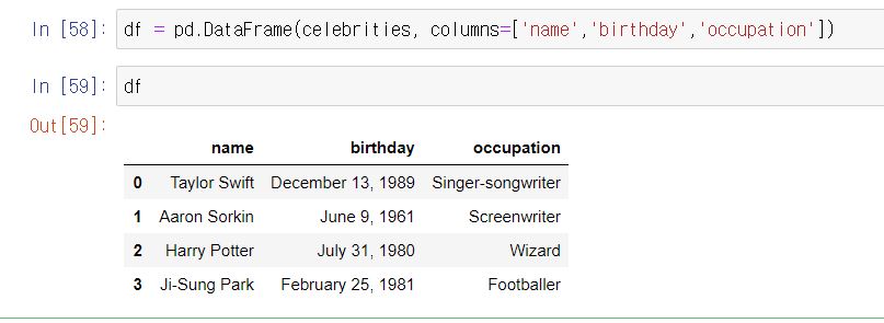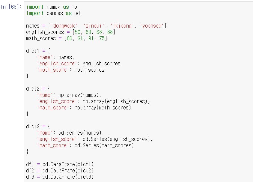 사전의 key로는 column 이름을 쓰고, 그 column에 해당하는 리스트, numpy array 나 pandas Series를 사전의 value로 넣는다.