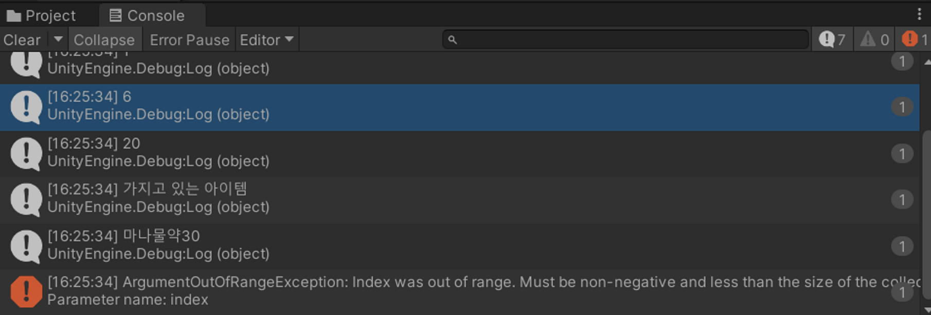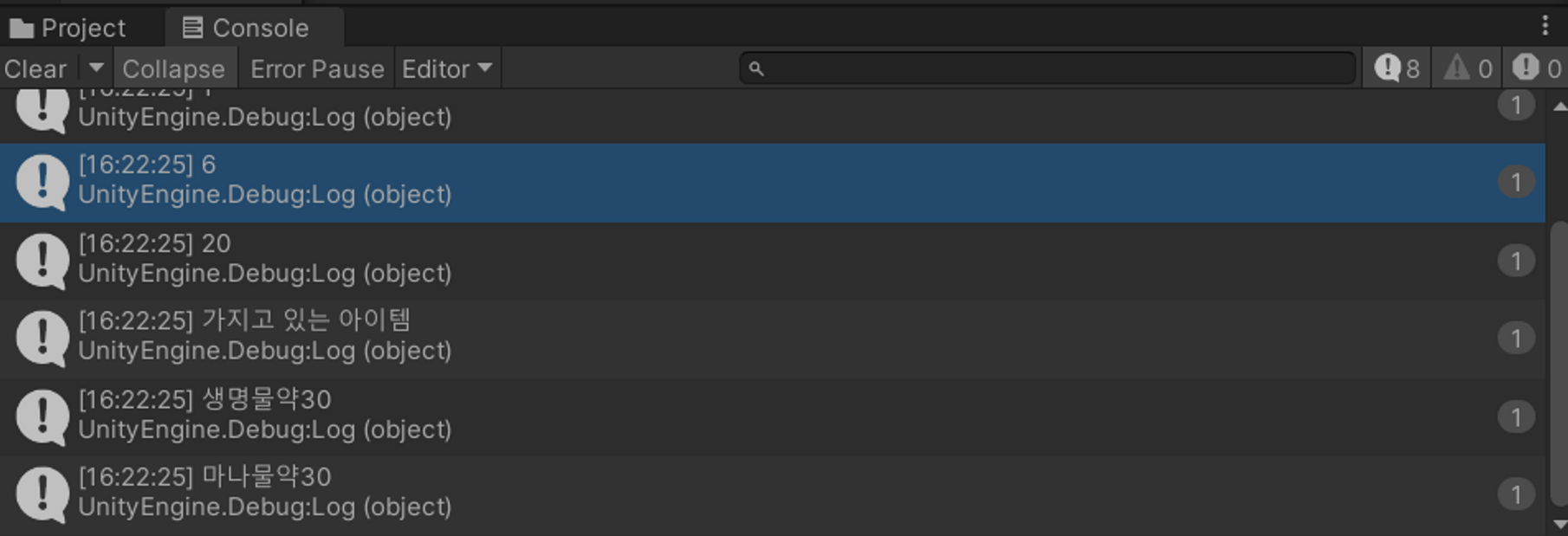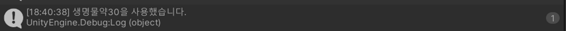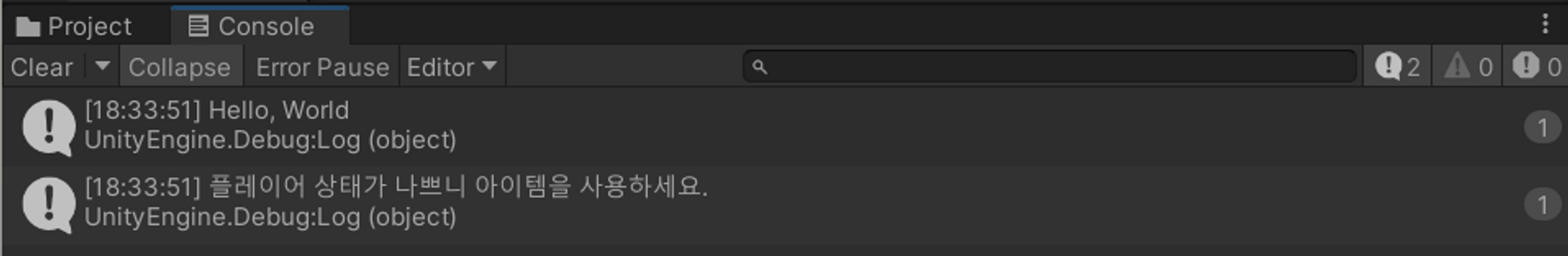Debug.Log("플레이어 상태가 나쁘니 아이템을 사용하세요."); 실행