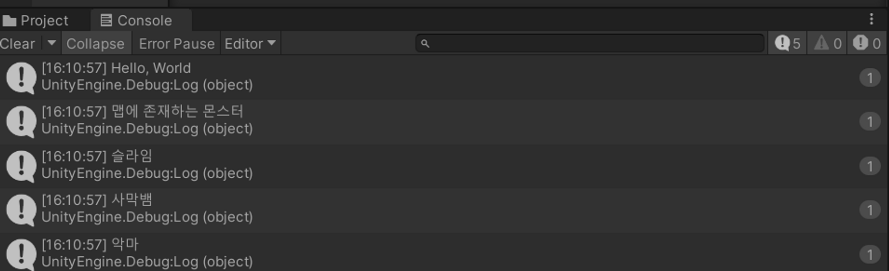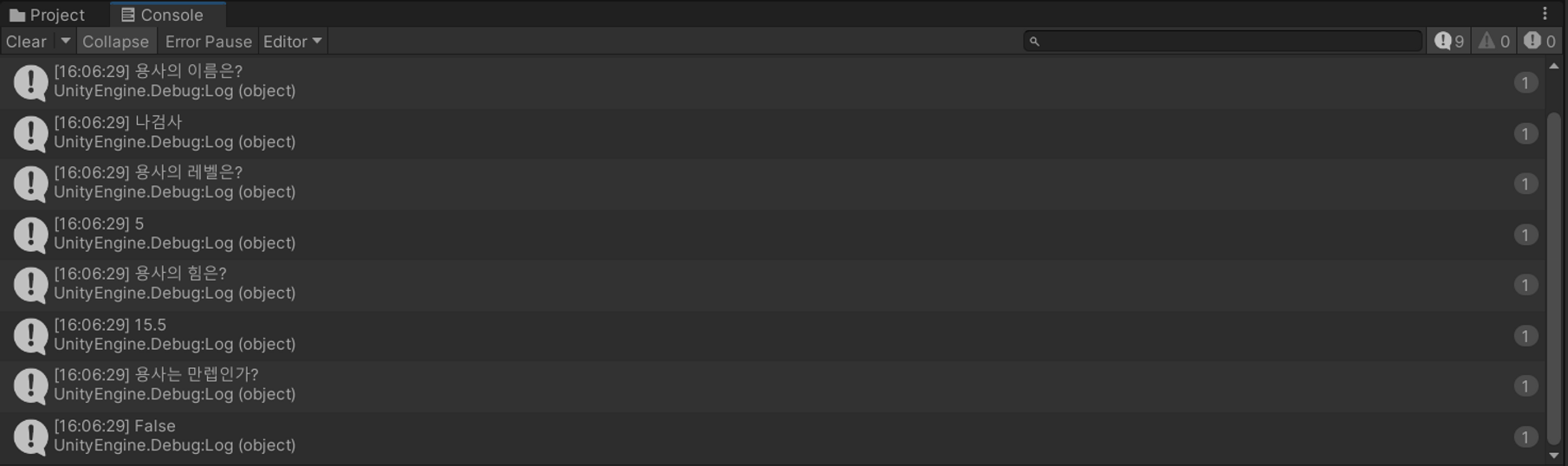 int level = 5;)float strength = 15.5f;)string Name = "나검사";)bool isFulllevel = false;)using System.Collections;