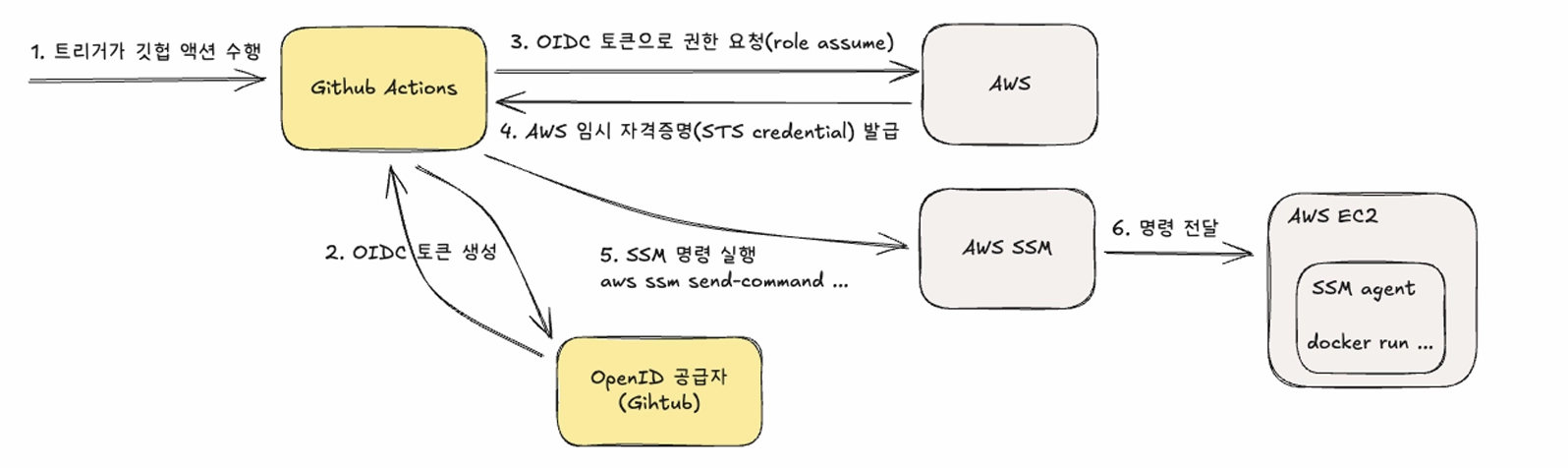 흐름도: GitHub Actions → AWS 인증 → AWS SSM → EC2 명령 실행