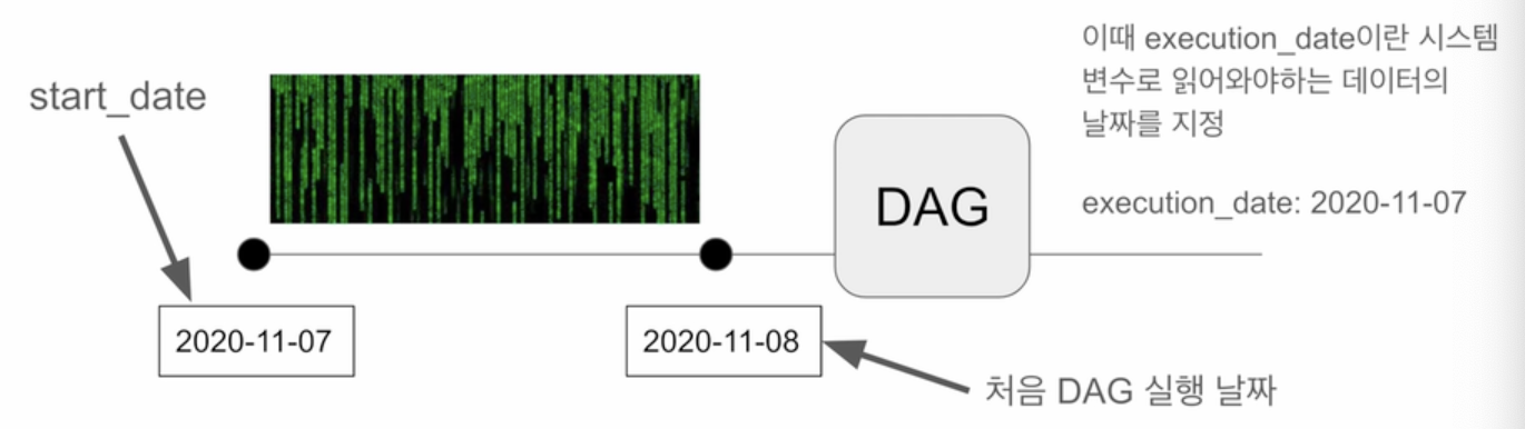 - 데이터 엔지니어는 읽어와야하는 데이터의 날짜를 계산하지 않고 시스템이 지정해준 날짜를 사용