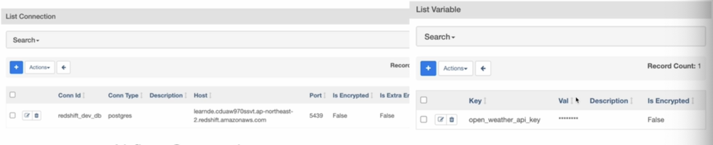 Airflow Web UI에 Admin에 Variables와 Connections가 있다.