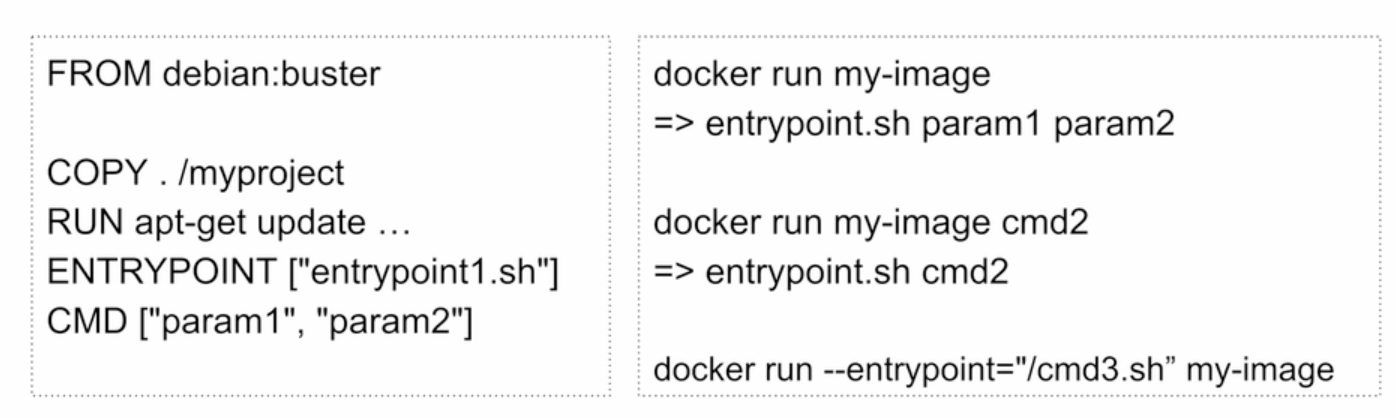 - docker run : 컨테이너 시작, dockerfile의 entrypoint 세팅되어있으면 cmd의 값을 파라미터로 받아서 할거고, cmd만 있으면 cmd가 실행됨